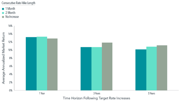 Source: Monthly target federal funds rate data from Federal Reserve Bank of St. Louis. The monthly series reflects the federal funds target rate from January 1983 through December 2008 and the federal funds target range—upper limit (ul) from January 2009 through December 2021. Equity market returns computed using monthly return to the Fama/French Total US Market Research Index, available from Ken French Data Library. There are 70 one-month rate hikes, 28 two-month rate hikes, and 389 months without an increase. Average annualized returns following consecutive rate increases starting at month end; performance time horizons can overlap. The Fama/French Indices represent academic concepts that may be used in portfolio construction and are not available for direct investment or for use as a benchmark. Index returns are not representative of actual portfolios and do not reflect costs and fees associated with an actual investment. See “Index Descriptions” below for descriptions of the Dimensional and Fama/French index data.