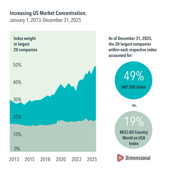 Taking a global perspective can help mitigate concentration concerns. The largest stocks represent a smaller share of markets outside the U.S., and that share has risen at a slower rate. At the end of 2025, the largest 20 stocks accounted for just 19% of the MSCI All Country World ex USA Index, a modest increase from approximately 16% at the start of 2013.