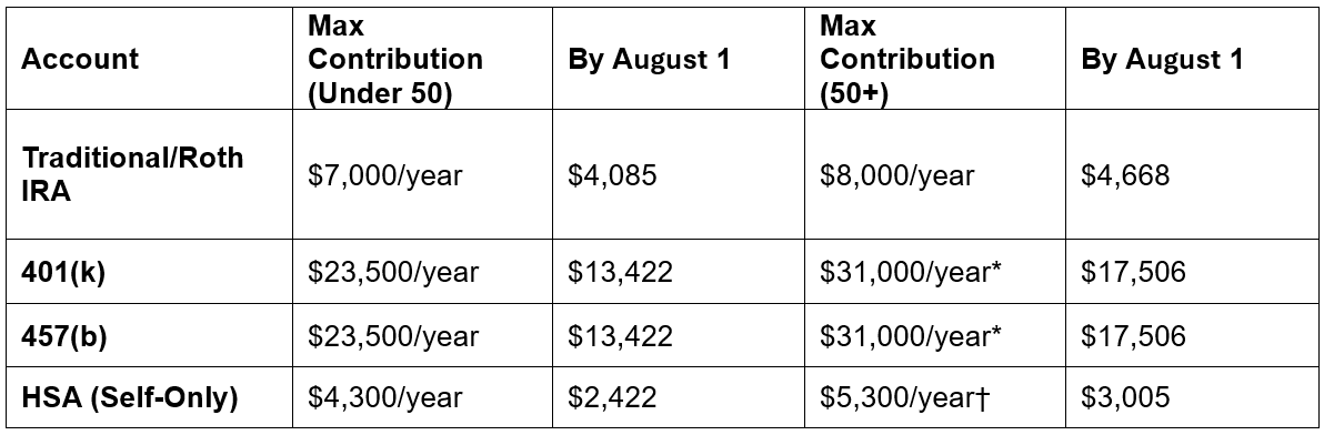 The chart below shows the 2025 contribution limits for qualified retirement plans—along with how much you should have contributed by midyear if you’re aiming to max out by year-end.