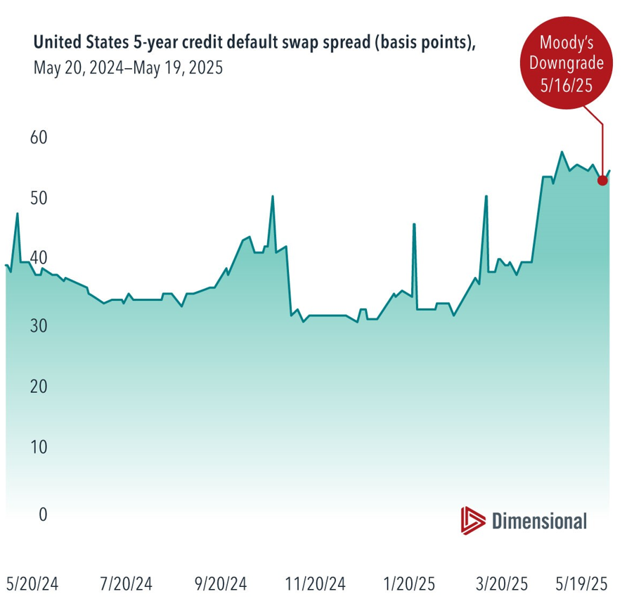 As with the Fitch example, credit default swap (CDS) spreads for the U.S. barely moved during the period surrounding the downgrade news. The CDS rate, which reflects the cost to insure against the U.S. defaulting on its sovereign debt, has been relatively stable since a rise in early April. That rise appears more correlated with the onset of tariff news that weighed on markets globally.