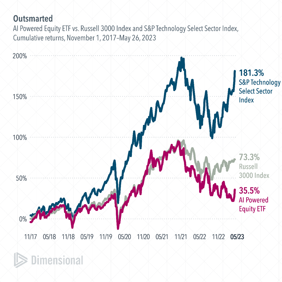 Perhaps it will be a little more surprising that the AI Powered Equity ETF, launched in 2017 using IBM’s AI, has lagged the market over the past six years, giving less than half the return of the broad Russell 3000 index of U.S. funds. It did even worse against stocks in its sector, technology, where it was beat more than five to one! (See graph below.)