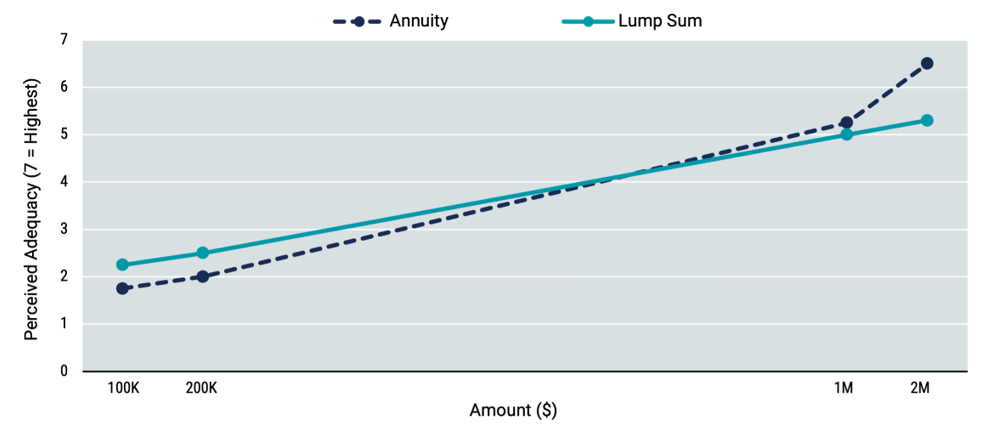 Not surprisingly, as shown in Figure 1, a lump sum of $100K didn’t rate very high on perceived adequacy. Our research participants gave it roughly a 2.25 on a 1-7 scale (where 7 represented “totally adequate”).